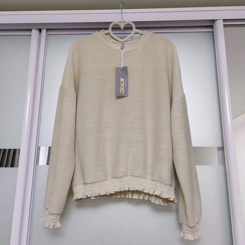 Стильная мякоть и очень приятная к телу кофтина от ONLY. Фасон-свободный. На рукавах и снизу украшена нежной резинкой. Мой пролет с размером. Заміри на фото.
