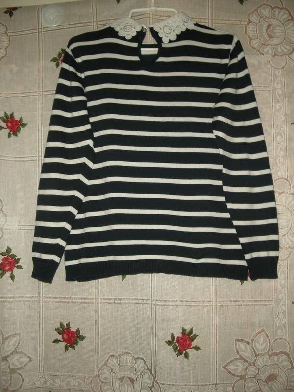 Классная,стильная,фирменная,натуральная кофта в бело-синюю полоску,сзади красивый яйцеподобный вырез,застегивается на пуговицу,шикарный вязаный в цветы воротничок"а-ля 30-е",объем груди-102см.,длина рукава-57см.,длина кофты-60см.