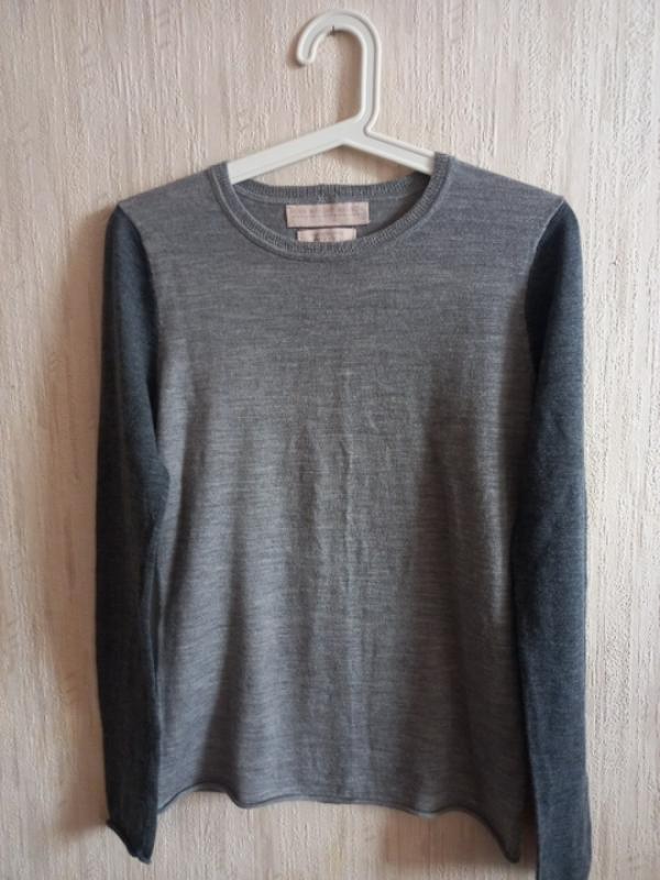 Джемпер з тонкої мериносової вовни , базова модель , з цікавими елементами. Двухкольоровий джемпер з імітацією застібки на гудзиках. ПОП-35 Рукав-62 Довжина- 62 Більш підійде на розмір S. Стан нової речі , без нюансів.