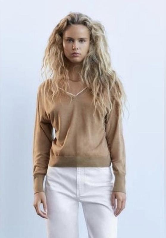 Стильний тонкий елегантний пуловер бежевого кольору з V-подібним вирізом горловини оздобленої тонким декоративним мереживом від відомого бренду ZARA в ідеальному стані.