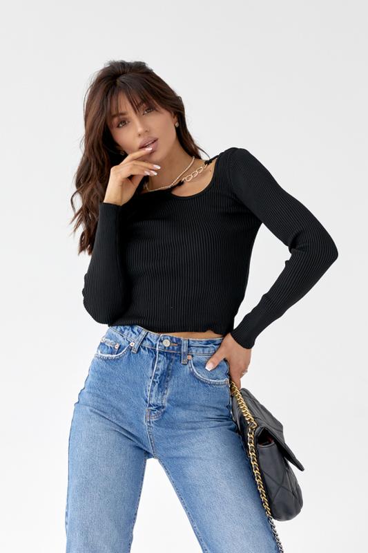 Эта модная кофточка покорит твое сердце не только своим трендовым дизайном, но эластичной тканью в мелкий рубчик. У модели круглая горловина обшита узкой окантовкой в тон и спереди украшена металлической цепочкой. Возле левого плеча расположен вырез, который придает изделию особый шарм. Рукава в изделии длинные, края низа прямые.