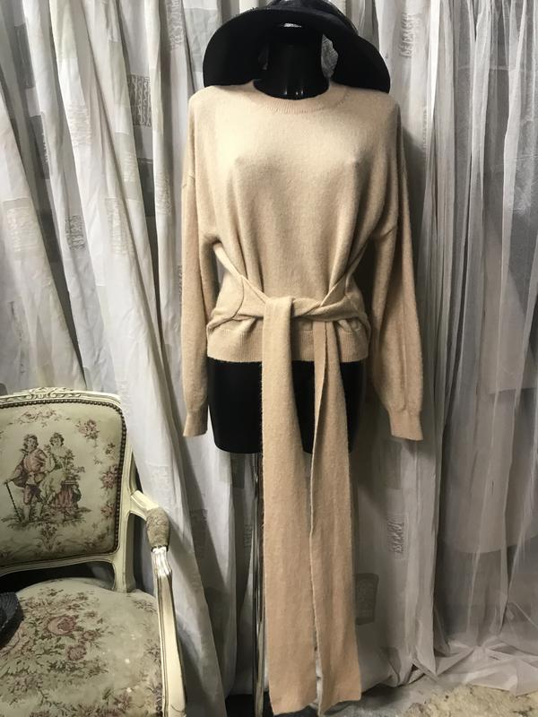 Стильный джемпер в идеальнейшем состоянии. Необычная модель с широким спущенным рукавом , в боковые швы вшиты широкие шерстяные ленты, которые можно завязывать в разных вариантах(длина позволяет). Размер по бирке М. Состав:шерсть/полиамид(73/27). Цвет:бежево-персиковый.