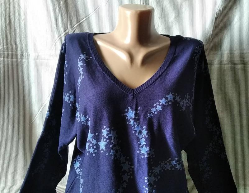 Натуральний,сучасний,з "зірковим" принтом.Рукав-"кажан". Всі виміри зроблені в спокійному (не розтягнутому) стані. ФОТО НА ТІЛІ НЕМАЄ. Довжина 64(з поясним манжетом) Завширшки(пахви) 53 Річ нова,без паперової бірки -СТОК