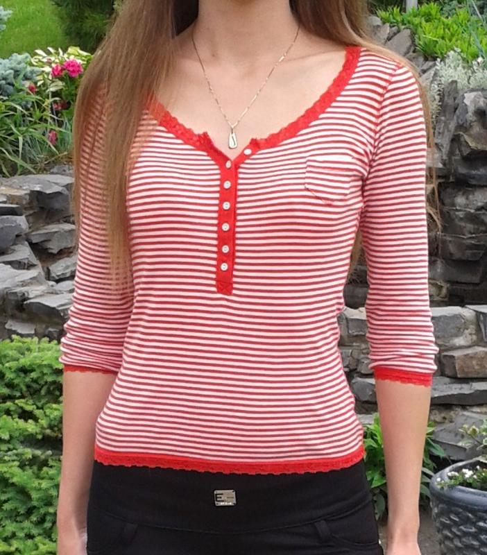 Кофта фирмы LTB, разм. XS На худи девушка. Цвет-полоска красного и свет бежевого цвета. Тканина -бавовна. По краям идет кружево. Стан новой вещи!!Оделась пару раз! Замеры: Длина - 52см Плечи-35см Бахвы-40см Рукав-41см.Длина 3/4.