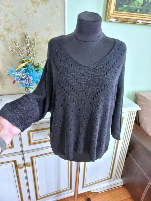 легкий джемпер, черного цвета, крой летучая мышь, По наборке L, но ориентируйтесь по замерам: длина 59, по бедрах 56, рукав 3/4, бибрка со составом срезана, состояние идеально