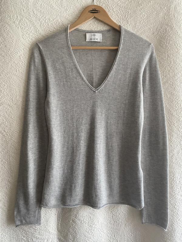 Чудовий базовий джемпер від елітного кашемірового бренду Allude. Ціновий сегмент: фото 7. Склад: на фото. Стан: ідеальний. Розмір: M, (Орієнтуйтесь на заміри). *Довжина по спинці: 63 см *ПОГ: 42 см *ПО по низу виробу: 43 см *Плечі: 40 см *Довжина рукава: 67-68 см Всі заміри зняті без натягу виробу. Доставка: Нова почта. Відправляю по 100% передплаті. Товар обміну та поверненню не підлягає.