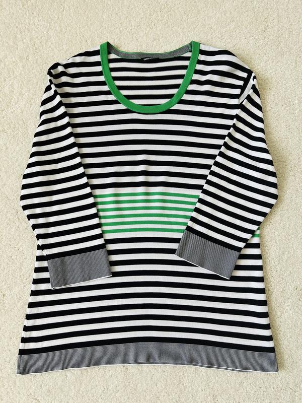 Смугастий яскравий джемпер з віскози та еластану з рукавом 3/4. Є дуже маленька плямка з внутрішньої сторони правого рукава (останнє фото). Бірка з розміром зрізана. Напівобʼєм грудей: 50 см (тягнеться до 55 см), напівобʼєм талії: 46 см (тягнеться до 51 см), плечі: 44 см, довжина рукава від плеча: 44 см, довжина джемпера по спинці: 62 см.