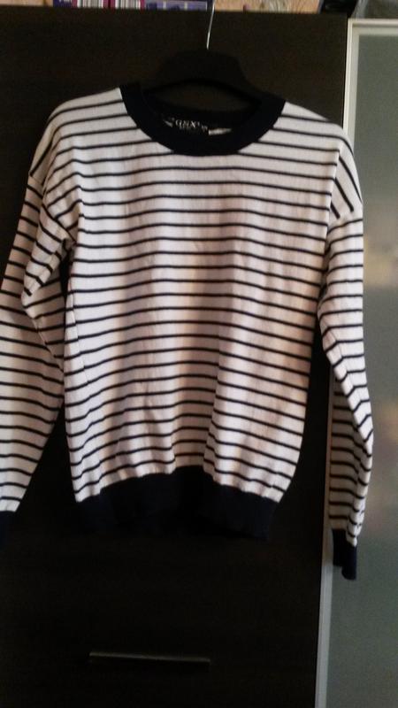 Свитерок GSX Размер L В составе есть шерсь 50%, но очень приятный к телу, мягкий, не колется вообще Цвет: сине-белая морская полоска На локтях синие сердечки пристрочены как аппликация Реальные замеры: Длина - 61см Плечи спущены Рукав от горловины - 72см Грудь от шва до шва - 50см