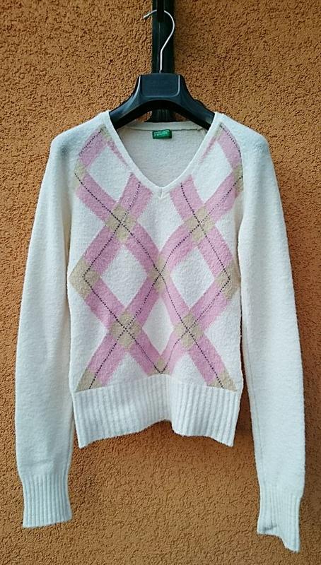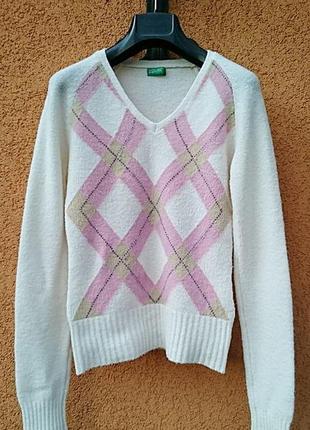 Стильный женский джемпер известной итальянской марки Benetton (оригинал). Довольно тёплый и приятный на ощупь. Был в носке сезон. Без дефектов. Длина по спинке: 55 см. Сделано в: Италия.