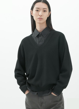 Состав: 62% полиэстер, 38% вискоза V Neck Long Sleeve Sweater Uniqlo U ткань из смеси вискозы элегантный ребристый трикотаж гладкого кроя с глубоким треугольным вырезом универсальный свитер для любого случая
