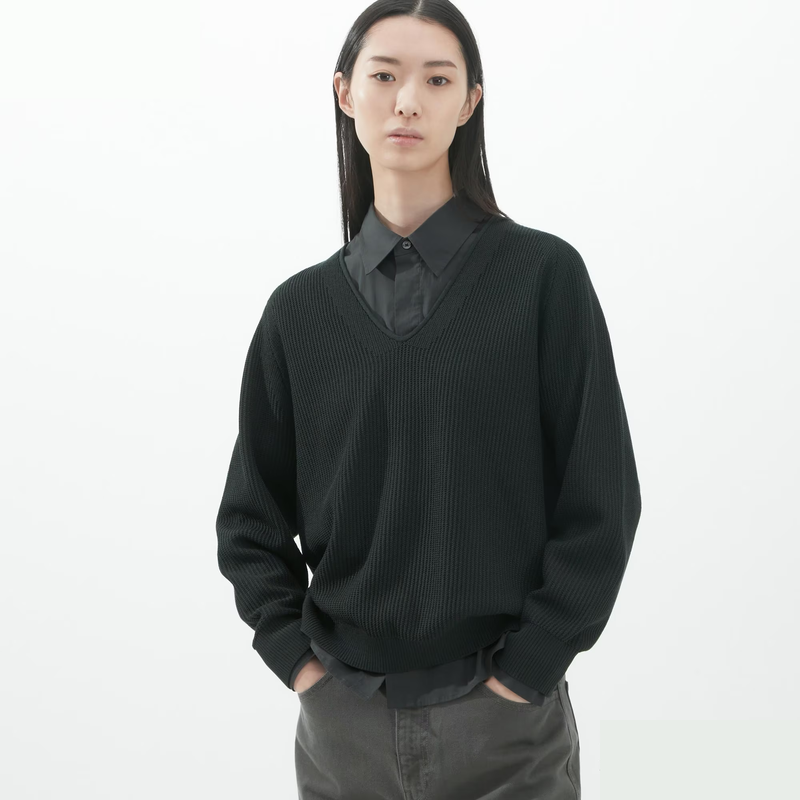 Состав: 62% полиэстер, 38% вискоза V Neck Long Sleeve Sweater Uniqlo U ткань из смеси вискозы элегантный ребристый трикотаж гладкого кроя с глубоким треугольным вырезом универсальный свитер для любого случая