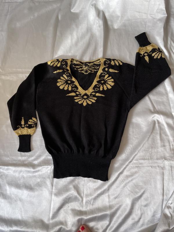 Вязаный джемпер черного цвета, детали золотистая нить. Полушерсть. ПОГ 58 см, длина 67 см, рукав от горловины 74 см (спущен). Надевался пар раз. Резинки не растягиваются.