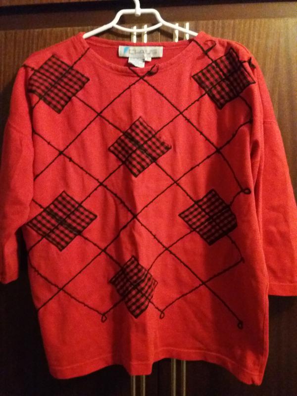 трикотажный свитер; длина 65см, плечи65см., ПОГ 65см., пояс 60см., рукав 3\4 32см. хорошее состояние, плотный трикотаж, немного тянется