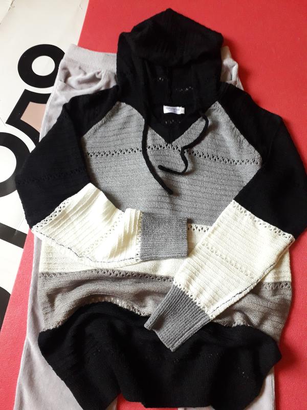 Стильный вязаный, ажурный джемпер с капюшоном. Красивое сочетание цветов – серый,черный,беж и белый. Вспень также в сочетании цветов. Ткань мягкая, приятная к телу, тянется. Бирки со составом отсутствуют, но ощущается вискоза и полиэстер. Замеры в искушенном состоянии: Плече зпущене Пог 53 По низу 49+разрезы Рукав от горловины 74 Длина 73. Возвращение нет. Нова,укрпошта.