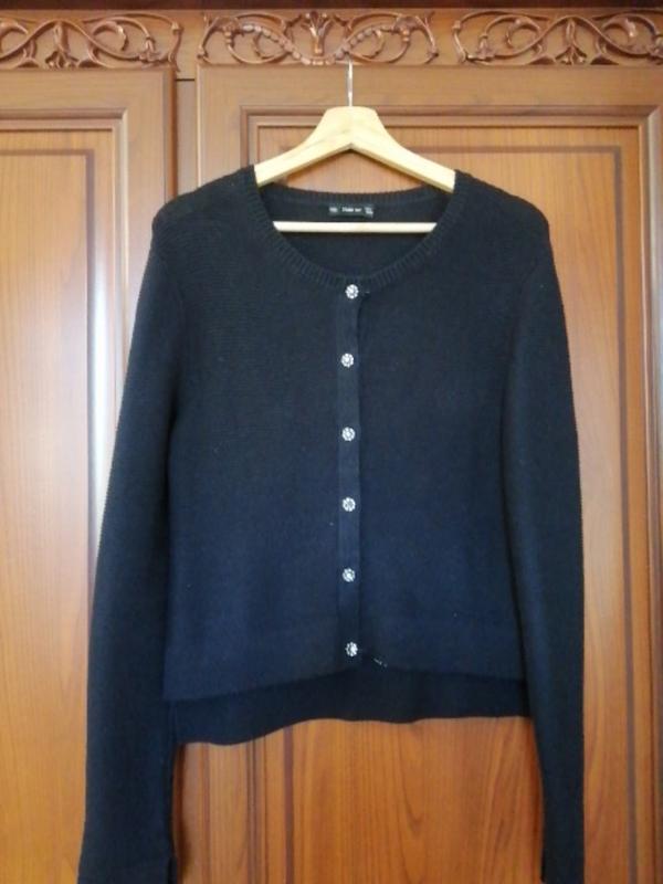 Хлопок, плотная вязка, пуговицы расщепляются, отсутствует один камушок на пуговице Пог 45, рукав 66, плечо 12, длина по спинке 59, полочка 54 (спинка длиннее 5 см) Очень хорошо тянется