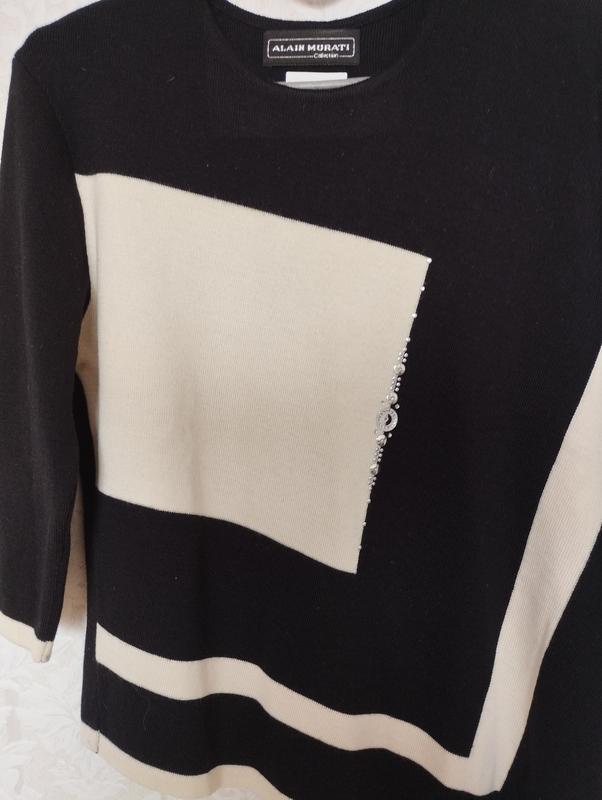Красивый свитерок в идеальном состоянии.Есть серебряное украшение.Оригинально удленнена передняя полочка с левой стороны.Рукав 3/4.