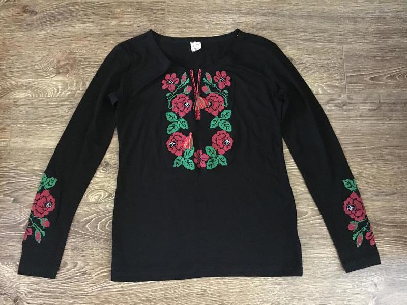 Прекрасная кофточка с вышивкой. Купила маме, не подошёл размер. Длина 60см, в плечах 41см, внизу ширина 42см, в груди тоже 42см, длина рукава без плеча 56-57см. Хорошо тянется.