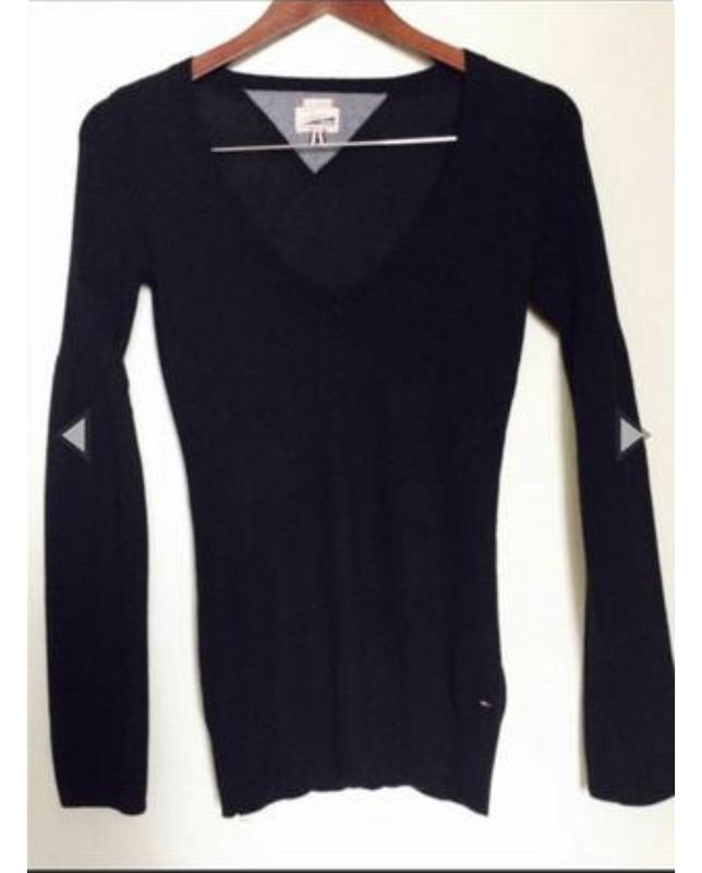 Черный тонкий свитерок, из оригинальной коллекции Hilfiger denim, рукав резинка облегающая бицепс, а дальше свободный до манжета(фото) я носила на S , покупали в Испании