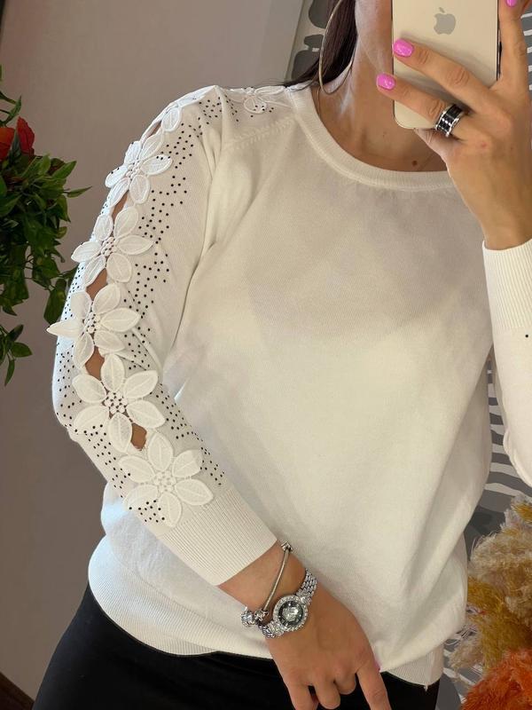 ЧАРІВНА КОФТОЧКА ВІЛЬНОГО СИЛУЕТУ З КРУГЛИМ КОМІРОМ НА ГУМЦІ ВНИЗУ І РУКАВАХ ВИКОНАНА З ТРИКОТАЖУ ГЛАДКОЮ МАШИНОЮ ВЧЗКІ, ПРИКРАШЕНОГО НАПРОЧУД КРАСИВОЮ АПЛІКАЦІЄЮ І РОЗСИПОМ СТРАЗ НА РУКАВАХ, КОФТОЧКА ВИГЛЯДАЄ ДУЖЕ ПРИВАБЛИВО, ВІДМІННО ПІДІЙДЕ НА БУДЬ-ЯКИЙ ТИП ФІГУРИ, В НЕЇ НЕ МОЖЛИВО НЕ ЗАКОХАТИСЯ РОЗМІР ЄДИНИЙ 42-46 ДОВЖИНА 60 СМ, НАПІВОБХВАТ ГРУДЕЙ 54 СМ ДОБРЕ ТЯГНЕТЬСЯ, ДОВЖИНА РУКАВА ВІД ШИЇ 66 СМ