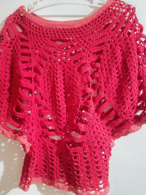Кофтина ажурного плетения, ручная работа. Длина 59см, ширина выражения горловины 29см. Широкий вырез для рук. Подойдет для темного гольфа или футболки. Цвет фактически темный красный. камера добавляет яркости. Сделаю дополнительные фото по запросу