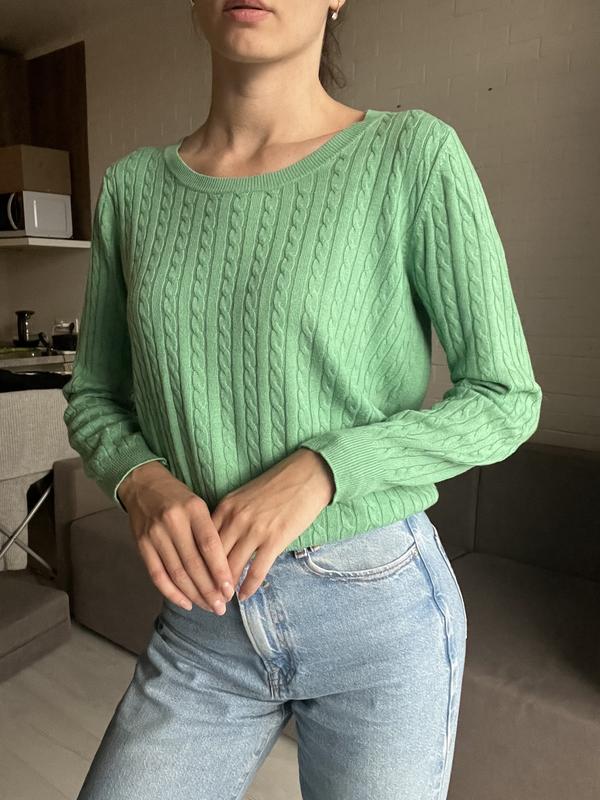 Легкий свитерик приятного салатового цвета (в реальности цвет немного насыщеннее, чем на фото). Приятный к телу, тянется. Размер М, сядет и на Л. Одягнено на параметри 174, 89-62-90. Материал полиамид+вискоза. Состояние очень хорошее, без дефектов.