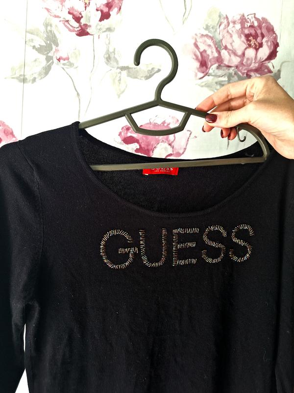Оригинал Guess Легкий джемпер Тонкая вязка Круглая горловина Большой логотип вышитый бисером Красиво сверкает Цвет черный Мягкий к телу,приятный на ощупь Размер XS-S Без дефектов Как новый
