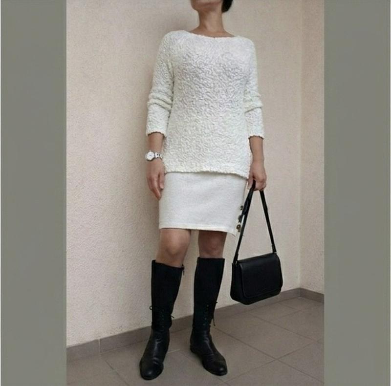 Джемпер вершкового кольору, фактура ниток неоднорідна,склад- 52% поліестер,48% акріл рукав-реглан ,розмір М НОГ-44 довжина -73 Майже повне співпадіння по кольору зі спідницею на фото, вона також продається