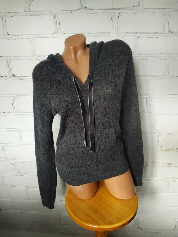 Джемпер з капюшоном, колір - сірий графіт з сивими ворсинками (ніби альпака). Бірок немає. Довжина від плеча 58 см, Пог 48 см, плечі 52 см, рукав від плеча 54 см