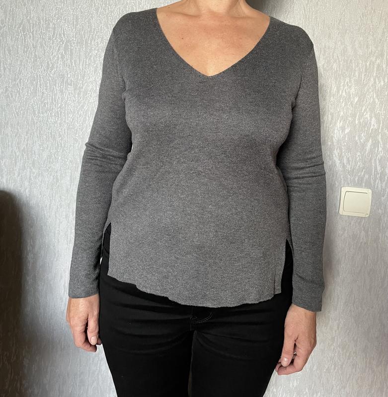 Кофта с v-образным вырезом, легкая и комфортная. По бокам маленькие распорки. Указан размер S, на фото одето на L. Торг возможен