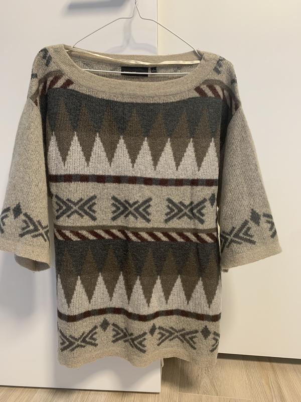 Джемпер з узором прямого крою, мʼякий, рукав широкий, вкорочений. Розмір вказаний S, але підійде і на M. Склад: 55% акріл, 30% нейлон, 15% мохер. Заміри : довжина 69 см, рукав від горловини 44 см, напівобхват під руками 53 см, по низу 55 см.