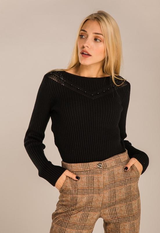 Базовый черный джемпер в рубчик из хлопково-акриловой пряжи, имеет универсальный вырез лодочкой позволяет надеть любое украшение на шею, или связать шелковый платок, на груди джемпер отделан легким ажурным узором. Ширина подмышками 44см, комфортно тянется до 52 см. Длинна рукава 59 см, ширина плеч 37см. "Лодочка" 22см. Ширина низа 37см, тянется до 50см.