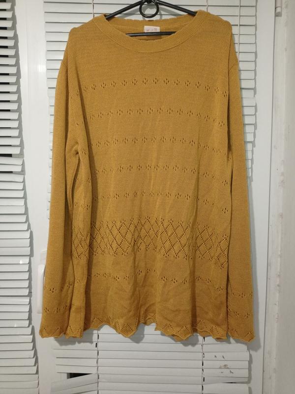 Приємний джемпер, колір насправді жовтогарячий, як яєчний жовточок, тягнеться добре, заміри в спокійному стані НОГ 62 НОС 63, довжина 75