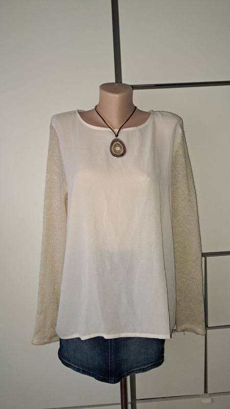 Стильна кофта Mango перед-шифон, рукав и спинка- вязаная ткань р-р XL пог-57 пос-66 длина перед/зад-66/79 плечо+рукав-79см(по модели-рукав немного удлиненный) состояние-новое, была одета 1 раз-следств носки нет