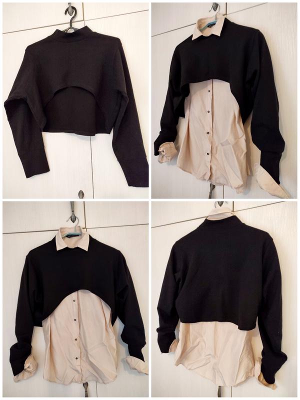 Очень интересный джемпер (хлопок , эластан) черного цвета , спереди укорочен - длина 18,5 см , по спинке длина - 38см . Плечи 40 см Длина плеча от горловины до шва проймы рукава - 12 см ; Длина рукава 54 см . Ширина проймы рукава - 22 см вещь в отличном состоянии. бирки с составом отсутствуют. По груди 56 см