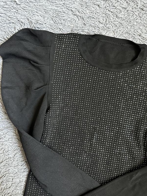 Женская укороченная кофточка черного цвета с фактурными плечами и стразами, размер ХС-С.