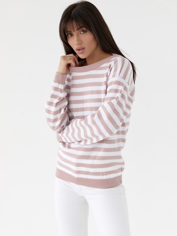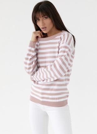 В'язаний джемпер в смужку. Виріб зі спущеною лінією плечового шва. Горловина, манжети та низ виробу зв'язані гумкою. Два універсальних розміри 42-48 і 48-54 Параметри моделі: 84х60х92 Зріст: 173 см Склад: 50% вовна, 50% акрил