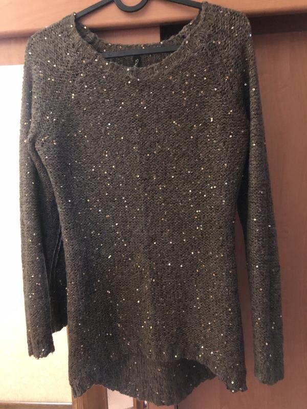 Кофта з цікавою спинкою, гарного шоколадного кольору з золотими паєтками, заміри на фото. замовлення нижче 100 грн не відсилаю, сайт тепер бере мінімум 15 грн комісію при покупці багатьох речей скидайте фото в одну переписку щоб я уточнила наявність Укрпошта 5 грн за пакет