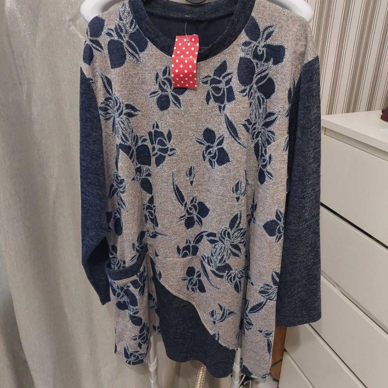 Джемпер-туніка Туреччина Розмір - XXXL, але дивись виміри Колір - синьо-серій у бежеві квіти, телефон трохи засвітив колір Одна кишеня, не рівний край. Склад не вказаний, за відчуттями поліестер, але приємний до тіла Тканина тягнеться Туніка під колготки або лосини Виміри в НЕ розтягнутому стані: Довжина - 85см ПО груди - 71см ПО талії - 68см ПО стегна - 75см Рукав від горловини – 72см Дивіться інші Мої оголошення, речі у продаж через закриття магазину, є маленькі та великі розміри батал