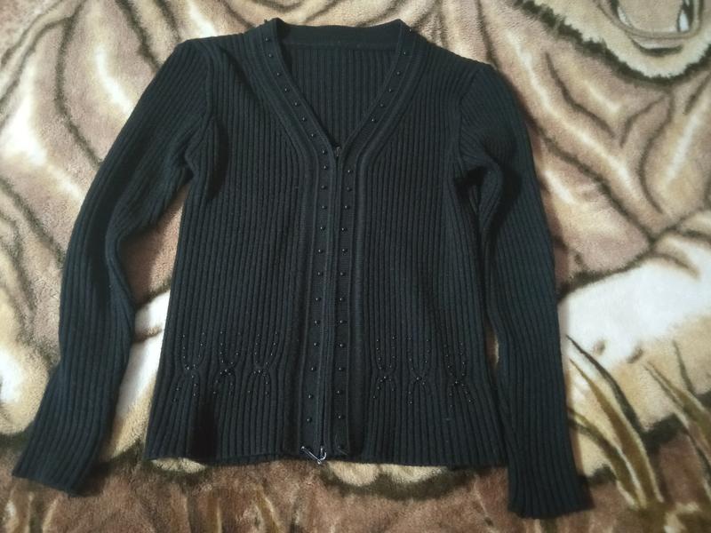 Тепла кофта прикрашена бусинками. Есть нюанс. Не хватает бусинок, все видно на фото. ПОГ 39 см, тянется + 3-4 см, рукав 57 см, длина 59 см.