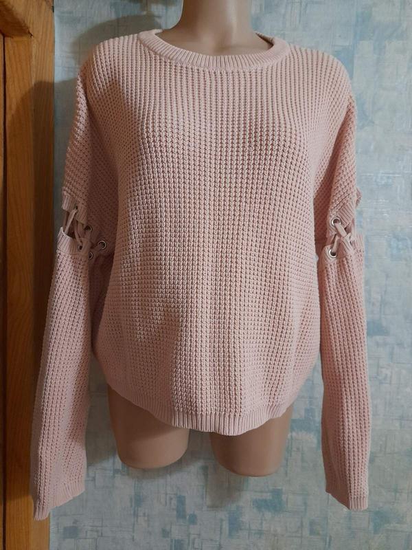 Оригінальний джемпер р 48 євр р L колір- крем пудра на рукавах шнурівка довжина - 50 см пог - 56 см довжина рукава- 60 см