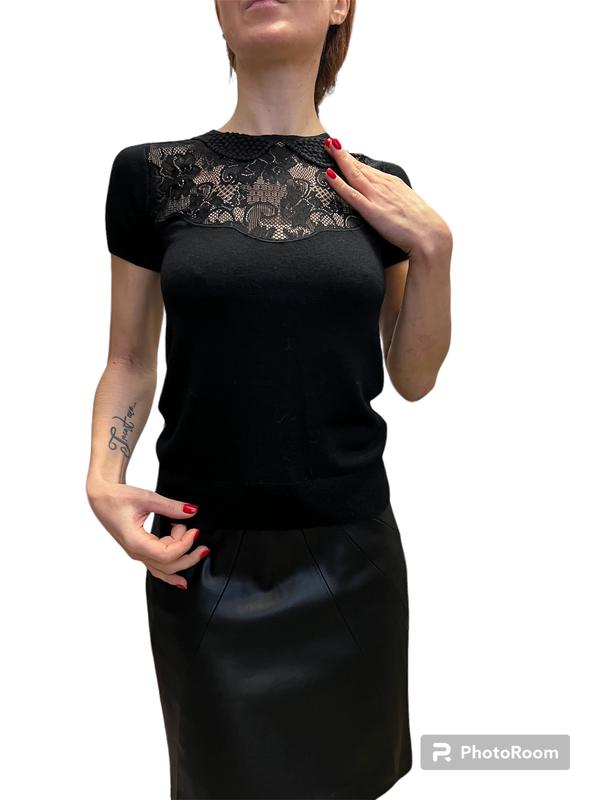Кофтинка від Benetton в стилі Valentino. Тонка пряжа. Незвичайний воротник. Мереживо на груді. Короткий рукав. Ця кофта придаст Вашому образу витонченого стилю. Позаду на ґудзику. Колір чорний. Рукав і край - вʼязана тендітна резинка. Стан ідеальний, навіть не памʼятаю щоб вдягала. Жодної зацепки або кошлатки. Підійде і під спідницю і під штани або під джинси. Классно підійде як на побачення, або вечірка так і офісний варіант. Із задоволенням, зброшу додаткові фото або відео.