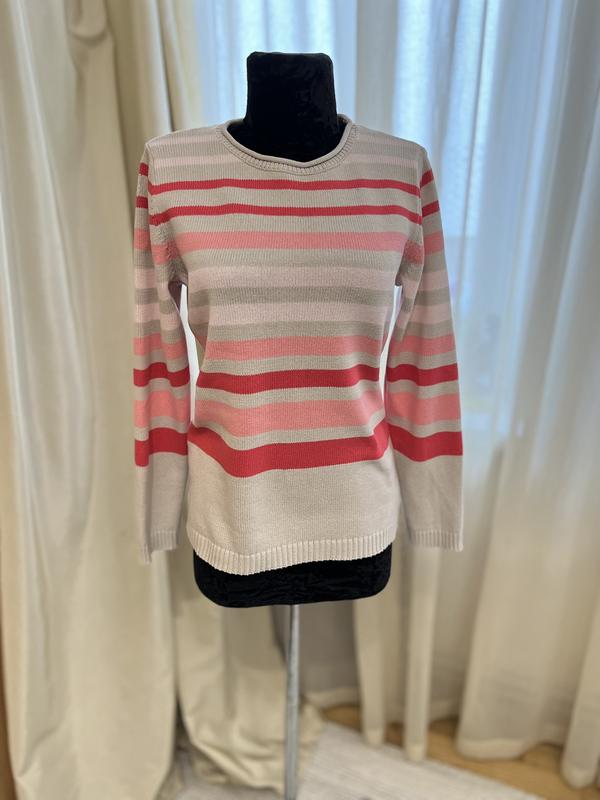 Яркий джемпер, бежевый в цветную полоску, 100% хлопок, плотный. Размер указан с, идет на см. Замеры: длина 57, плечи 35, рукав 57, пог 46/47. Тянется