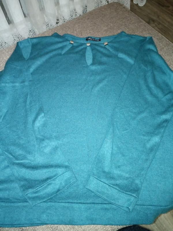 Кофта изумрудного цвета, золотистая фурнитура.материал вискоза, не кашлатится.ее нюанс., выпустило стрелочку где маленький вырез...в цене учтенный. материал тянется.потому подойдет и на больший размер грудь-57 внизу ширина 61 рукав56