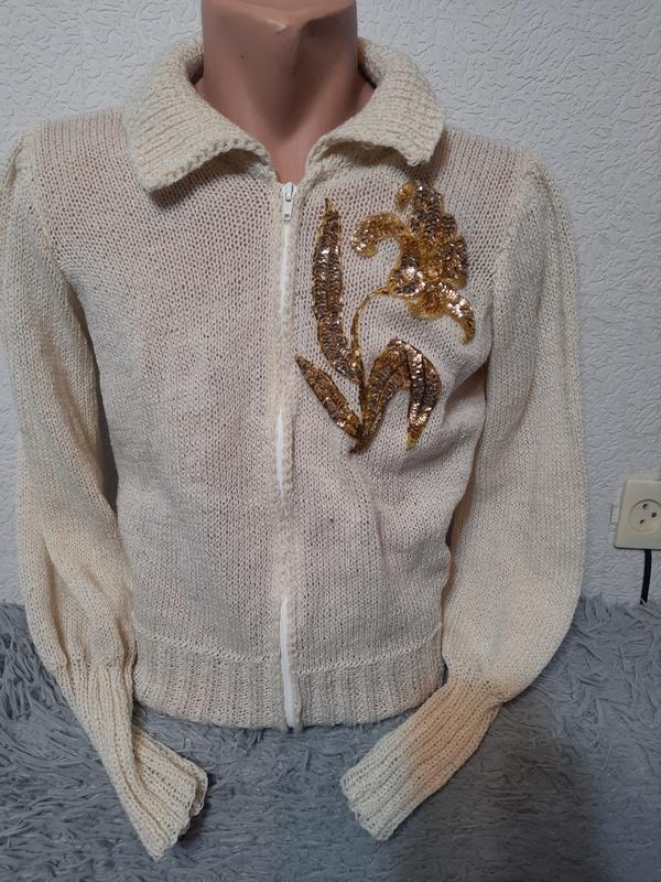 кофта на замке с орнаментом цветка,вязка с блестящей нитью, стильно и оригинально