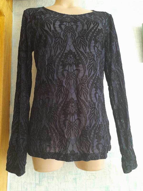 Кофтинка із квітковим принтом р. 48 англ р 14 пр-во Туреччина колір : синій із чорним велюровим візерунком склад :поліамід(нейлон) 93%,еластан 7 % довжина - 60 см довжина рукава - 62 см пог - 50 см