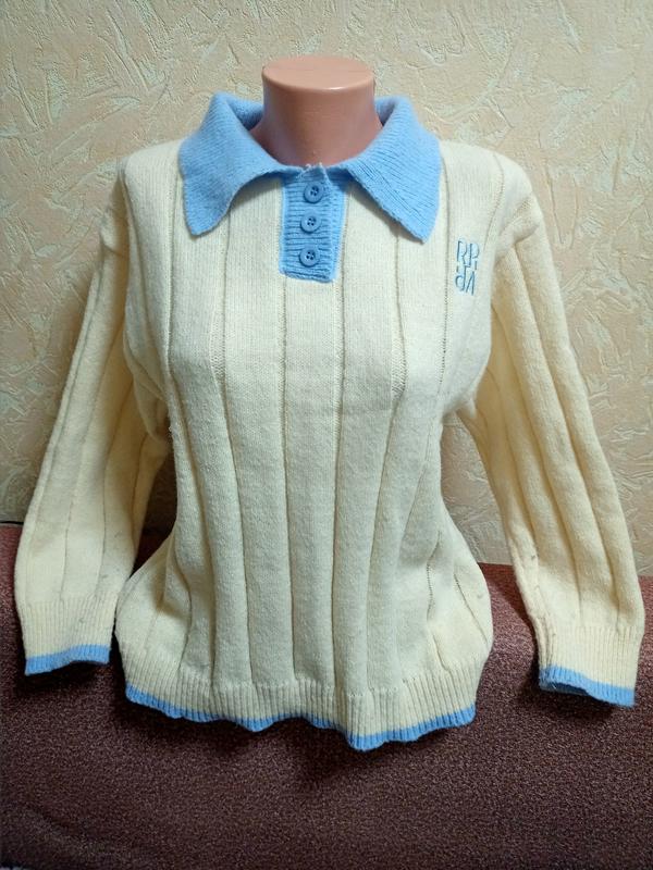 Очаровательный теплый джемпер на пуговицах с воротником. В составе акрил, полиамид. Без етикеток. Ног-54, длина-63, рукав-50, спущенное плечо.