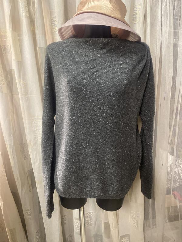 Красивый теплый джемпер. Цвет серый меланж. Состав: шерсть/шелк/полиамид(60/5/35). Размер по набору-М. Замеры:длина-67 см, ПОГ-60 см, ПОБ-44 см, рукав от ворота-79 см.