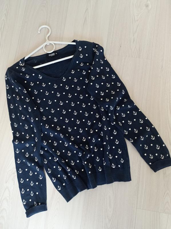 Кофта джемпер с якорями и сержечками/ Colloseum. Цвет темно синий с белым. Размер М. Линия груди 44, тянется больше. Длина от плеча 60 см. Длина рукава 64 см. Имеет дефект на одном рукаве ( фото). '