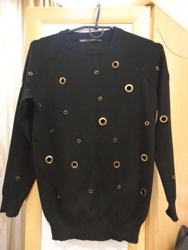 Стильный джемпер с металлическими дырочками. Тонкий, мягкий. Вискоза и полиэстер. Длина 65 см в груди 44 см., рукав от горловины, реглан 65 см.