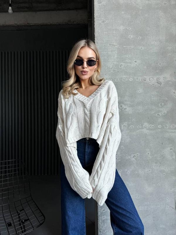 🖤Джемпер 🔴Цена 770 грн 🔥 Теплый джемпер. Укороченная модель с оригинальной вязкой, Длинный рукав дополнен эластичной манжетой. Аккуратная горловина с V-образным вырезом. • Размер универсальный • Длина 36 см • ПОГ 77 см • Рукав от шеи 74 см 3938/30